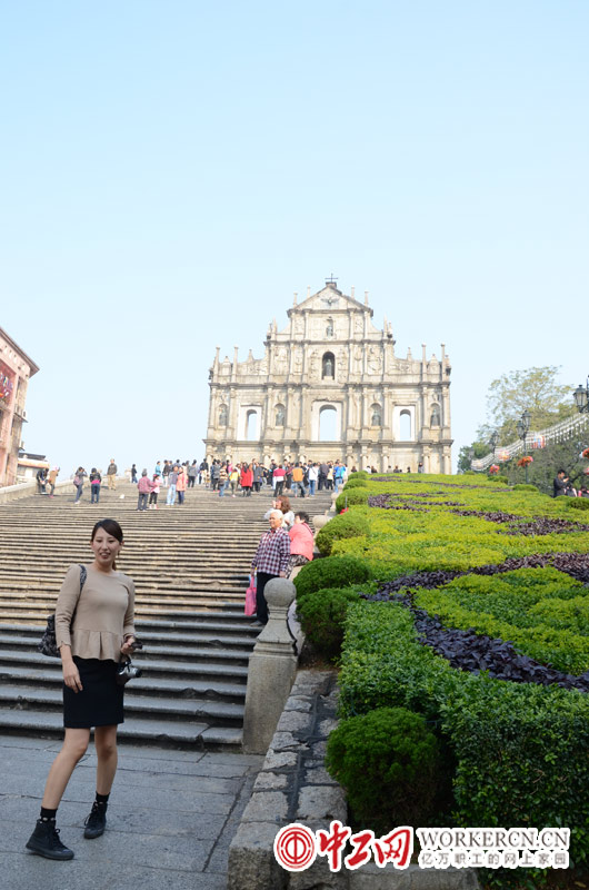 澳门(北纬 22°11',东经 113°33' ),全称中华人民共和国澳门特别行政区,北邻珠海,西与珠海市的湾仔和横琴对望,东与香港相距60公里,中间以珠江口相隔。澳门属亚热带季风气候,同时亦带有温带气候的特性,年平均气温约22.3℃,全年温差变化在11~14℃。台风季节为5-10月,以7-9月最为频密。图为12月7日,一位女游客着裙装游览澳门大三巴牌坊。即使在冬季,澳门也难觅寒冷,是冬季旅游的上选之处。 (中工网记者 笑语摄)