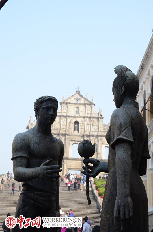 大三巴牌坊(Ruins of St.Paul),是澳门最具代表性的名胜古迹,为1580年竣工的圣保禄大教堂的前壁,此教堂糅合了欧洲文艺复兴时期与东方建筑的风格而成,体现出东西艺术的交融。雕刻精细,巍峨壮观。图片摄于12月7日,大三巴牌坊前一处以爱情为主题的雕塑,非常契合这座城市闲适、浪漫的气质。 (中工网记者 笑语摄)