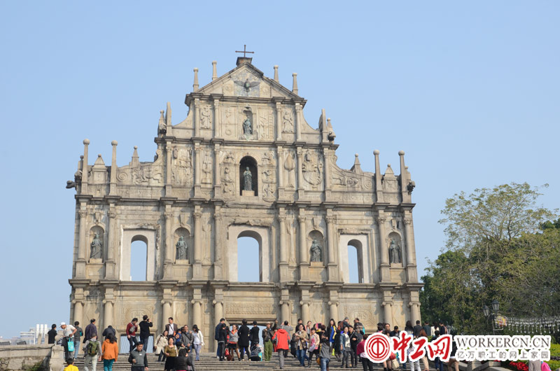 大三巴牌坊建筑糅合了欧洲文艺复兴时期与东方建筑的风格而成,体现出东西艺术的交融,雕刻精细,巍峨壮观。由三至五层构成三角金字塔形,无论是牌坊顶端高耸的十字架,还是铜鸽下面的圣婴雕像和被天使、鲜花环绕的圣母塑像,都充满着浓郁的宗教气氛,给人以美的享受。牌坊上各种雕像栩栩如生,堪称“立体的圣经”。图片摄于12月7日。 (中工网记者 笑语摄)