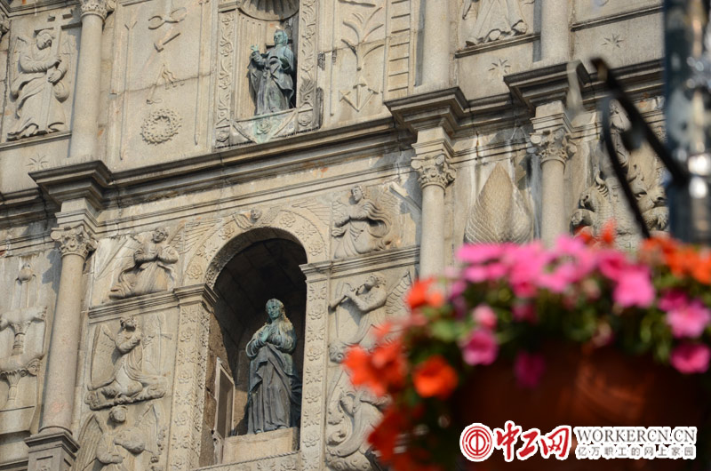 牌坊高约27米,宽23.5米,为意大利文艺复兴时期“巴洛克”式建筑物,共分五层,底下两层为同等的长方矩形,由三至五层构成三角金字塔形。顶端竖有“十”字架,其下嵌有象征圣灵的铜鸽;铜鸽像的旁边围着太阳、月亮及星辰的石刻,象征圣母童贞怀孕一刹那时光;铜鸽之下为一圣婴雕像,其左上是“永恒之火”的雕像,右侧则是“生命之树”的石刻;第三层的正中刻着一个童贞圣母像,旁边以牡丹和菊花环绕,前者代表中国,后者代表日本;雕像左方还刻有“永恒之众”。一艘“葡式帆船”及一个“面目狰狞的魔鬼”;第四层分别供奉耶稣四名圣徒的雕像;第三层与第四层的左右两侧,雕刻有中华民族传统文化艺术的象征动物-狮子;底层为三面门户,正门的楣额上用葡文刻着“MATERDEL”意即“天主圣母”,两侧的门上刻有耶稣的记号“HIS”。大三巴牌坊上各种雕像栩栩如生,既保留传统,更有创新;既展现了欧陆建筑风格,又继承了东方文化传统,体现着中西文化结合的特色,是远东著名的石雕宗教建筑。图片摄于12月7日,大三巴牌坊局部。 (中工网记者 笑语摄)
