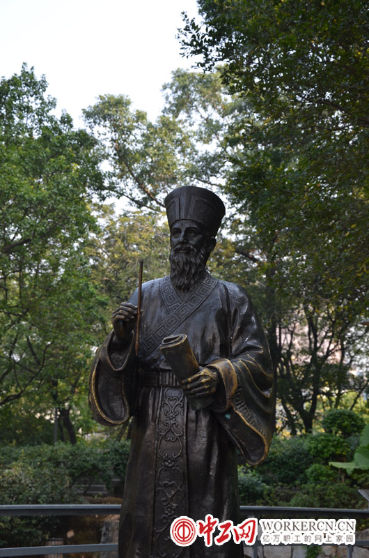 大三巴牌坊是西方文明进入中国历史的见证。1583年,著名的传教士利玛窦在这里改绘世界地图为《万国图》,加上中文标识,送给了中国地方政府。图为大三巴牌坊近侧的利玛窦雕塑。 (中工网记者 笑语摄)