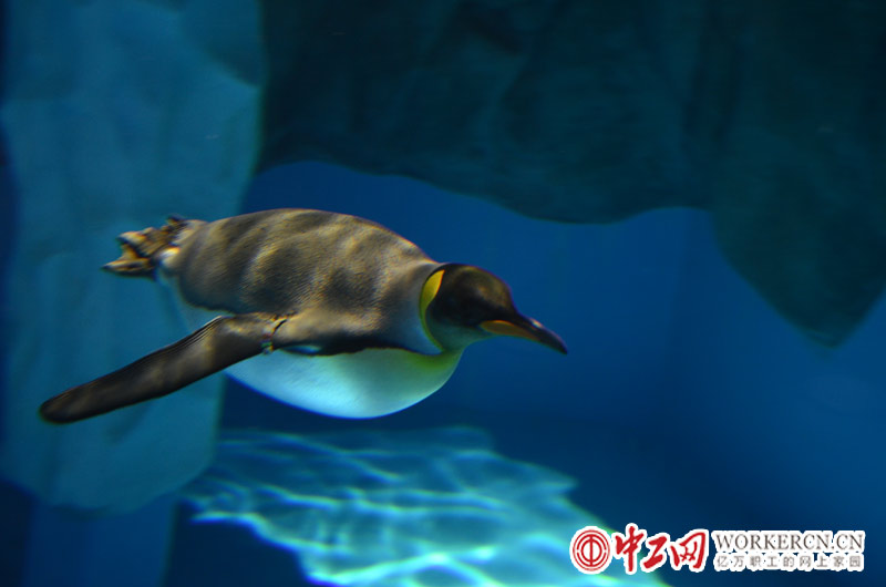 极地海洋动物管内的企鹅正在游泳。 (中工网记者 笑语摄)