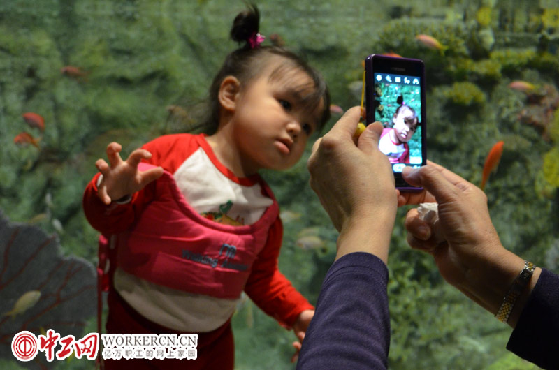 12月5日,一名小朋友在香港海洋公园“海洋天地”内与热带鱼类合影。该海洋馆是世界最大的水族馆之一。水体宽22米,长38米,水深达7米,分为4层,观众可由通道环绕参观。该馆按珊瑚礁布局,分深湖和泻湖两部分:深湖依据堡礁设计,泻湖参照缘礁摹造,两湖海水相通。馆内放养了太平洋岛屿及南中国海鱼类5000多条,约400多种,从体长不到2厘米的盐雀鲷到身长3米的豹纹鲨,还有海鳗、神仙鱼、石斑鱼等各种珊瑚礁鱼类。该馆还设有“珊瑚和珊瑚礁”展览,介绍有关珊瑚礁的形成。 (中工网记者 笑语摄)