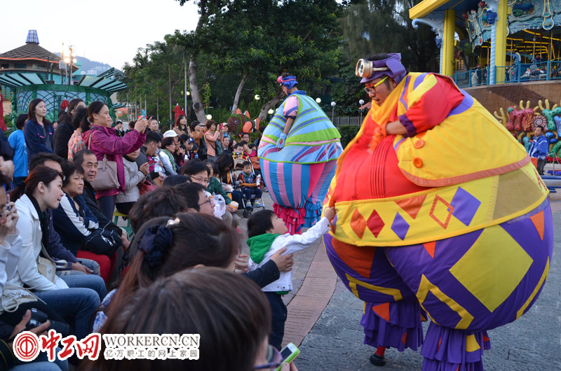 12月5日,香港海洋公园内的小丑演员与小朋友互动游戏。 (中工网记者 笑语摄)