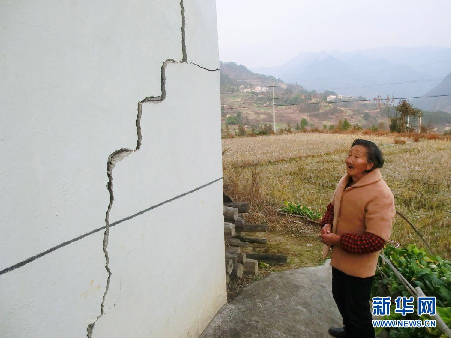 12月16日,湖北省巴东县溪丘湾乡杨祖秀老人在查看被地震损坏的房屋。