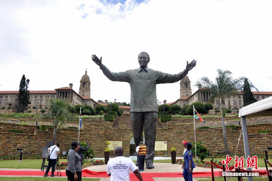 12月16日,一座高9米的新曼德拉雕像在南非行政首都比勒陀利亚正式揭幕,上万民众在总统府前聚集见证历史性的一刻。新曼德拉雕像是一座高9米镀铜雕像,于12月13日用吊车将新曼德拉雕像放置在总统府供人民瞻仰。南非每年的12月16日是法定假日“和解日”,南非政府将新雕像亮相日期定于“和解日”象征着在南非历史上一个新时代的开始。图为新雕像在阳光照射下熠熠生辉,曼德拉面带慈祥的微笑,张开双臂如同拥抱整座城市。中新社发 刘磊 摄