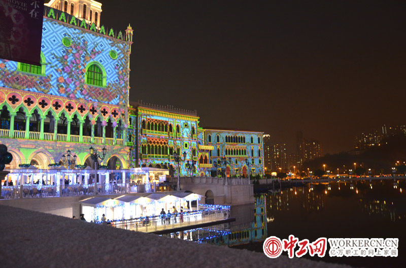 澳门威尼斯人前座建筑物外墙上的大型3D光效投射汇演局部。 (中工网记者 笑语摄)
