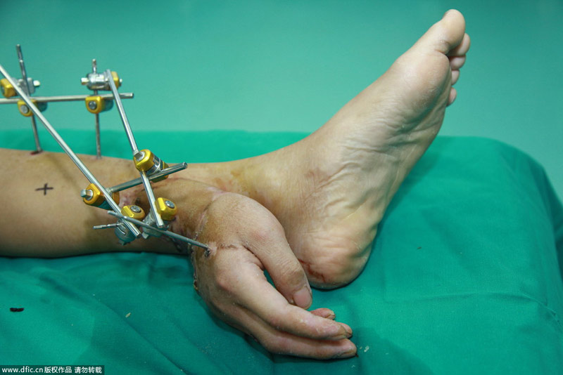 湘雅医院手显微外科主任唐举玉教授率领其团队通过分期手术,成功将寄养于患者小腿上的右手回植于右前臂。专家表示,该手术的成功充分体现了湘雅医院手显微外科在显微重建学科领域已达到国际领先水平。悲剧发生在一个月前,25岁的常德小伙子小伟在务工时由于操作失误,导致右上肢不慎卷入钻床机,整个右手瞬间被机器完全离断,顿时血流如注。伤后7小时,小伟终于抵达湘雅医院。经手显微外科主任唐举玉教授仔细检查后发现,患者右上肢自前臂完全离断,但与以往不同的是,其不光有绞压还有撕脱,造成了大面积皮肤软组织缺损和血管、神经、肌腱撕脱缺损,尺桡骨暴露在外,伤情的确极为严重。常温下断指要在10个小时内恢复血供,因为如果缺血时间过长,断指将无法再植。而此类断肢耐受缺血的时间则更短,这就要求医务人员务必争分夺秒,尽可能地缩短离体肢体的缺血时间。经过反复论证,唐举玉教授为小伟制定了分期手术挽救断肢的方案,即一期将断肢彻底清创后寄养于小腿,待患者寄养肢体成活、全身情况恢复良好后,再开展寄养肢体原位回植术。据悉,该方案不仅可以大大降低手术风险和术后感染的发生率。更为关键的是,由于断肢缺血时间的大大缩短,还可有效避免离体肢体内肌肉的缺血坏死,有望为断肢后期的功能恢复创造最好的条件。2013年12月4日,由该院手显微外科主任唐举玉教授等专家组成的手术团队历经9个小时,红润的右手终于顺利“回归”。看着“失而复得”的右手,小伟开心地笑了。专家表示,小伟再植的右手和移植的皮瓣如今均已成活,且创口愈合良好。