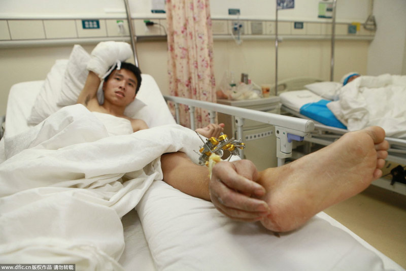 2013年12月4日,湖南长沙,二期寄养回植手术前。一个月前,25岁的常德小伙小伟右手手臂不慎被机器绞断,湘雅医院医生决定先将断肢寄养在左小腿再回植,避免肌肉缺血坏死,为后期功能恢复创造最好条件。