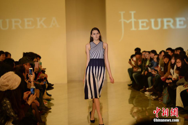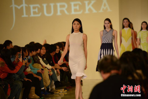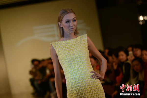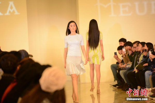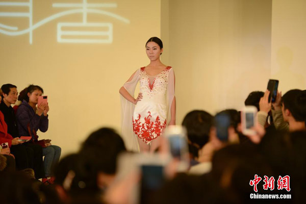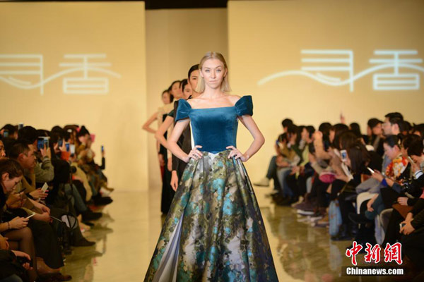 12月17日晚,成都(纽约)国际时装周上演第四场设计师作品秀。本场时装发布秀展示了以“复古年代”为主题的高定礼服和以“探索”为主题的全针织系列服装。在发布秀上,“复古年代”的高定服装分别用米灰、墨绿、大红三个色系诠释了古典的时尚与内涵。张浪 摄
