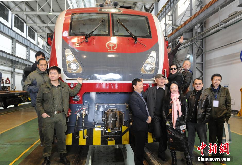 12月18日,参加“美丽湖南·网络名博三湘行”的嘉宾们在株洲电力机车工厂内与一辆和谐D1D型号的新型列车合影。据南车株洲电力机车有限公司宣传部长韩军介绍,该辆新型的普轨列车将在春节期间投入运行,时速可达160km/h,有助于缓解春运压力。中新社发 杨华峰 摄