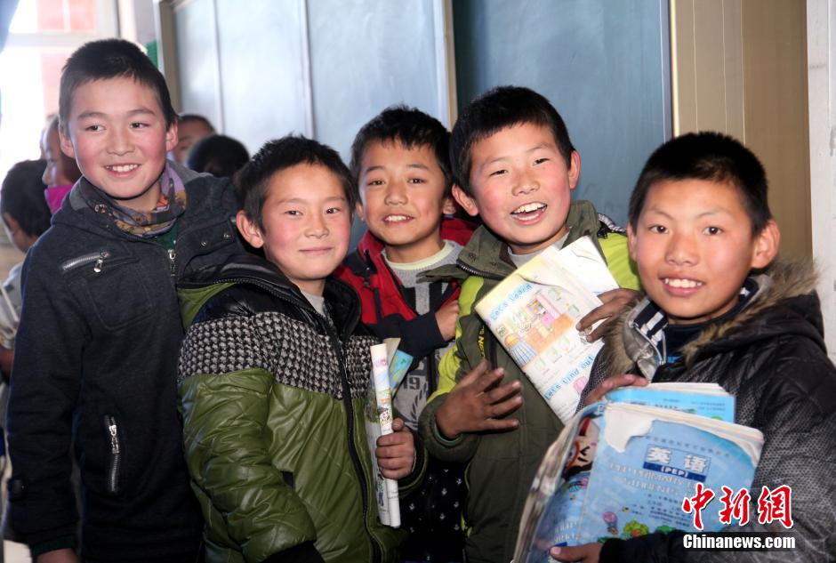 12月18日,青海省海南藏族自治州共和县第一民族寄宿制小学内,拿着英语课本的藏族学生。该校共有2200多名学生,其中少数民族学生占99%。除137位专任教师外,学校还为学生配备了27名炊事员,11名保育员,4名保安,5名洗衣员等。该校实施藏、汉双语教学。中新社发 陈小愿 摄