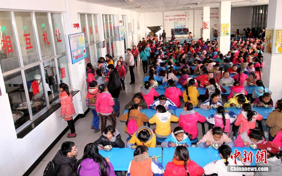 12月18日,青海省海南藏族自治州共和县第一民族寄宿制小学内,学生们在食堂用餐。该校共有2200多名学生,其中少数民族学生占99%。除137位专任教师外,学校还为学生配备了27名炊事员,11名保育员,4名保安,5名洗衣人员等。据了解,当地政府为每位学生每年补助生活费2000元,学生自己只需缴纳500元。中新社发 陈小愿 摄