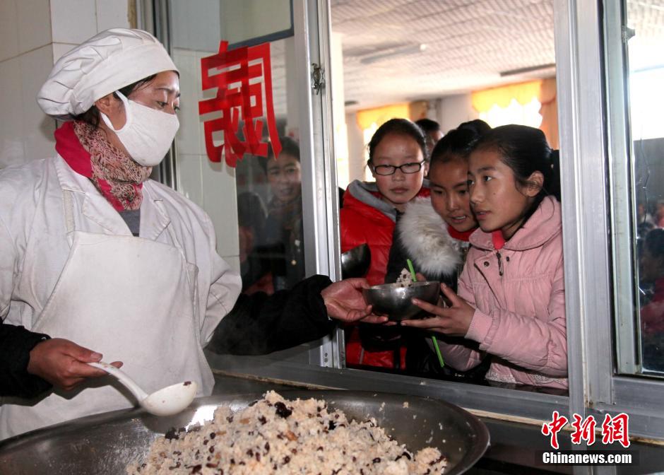 12月18日,青海省海南藏族自治州共和县第一民族寄宿制小学内,食堂里的炊事员为学生打饭。该校共有2200多名学生,其中少数民族学生占99%。除137位专任教师外,学校还为学生配备了27名炊事员,11名保育员,4名保安,5名洗衣人员等。中新社发 陈小愿 摄