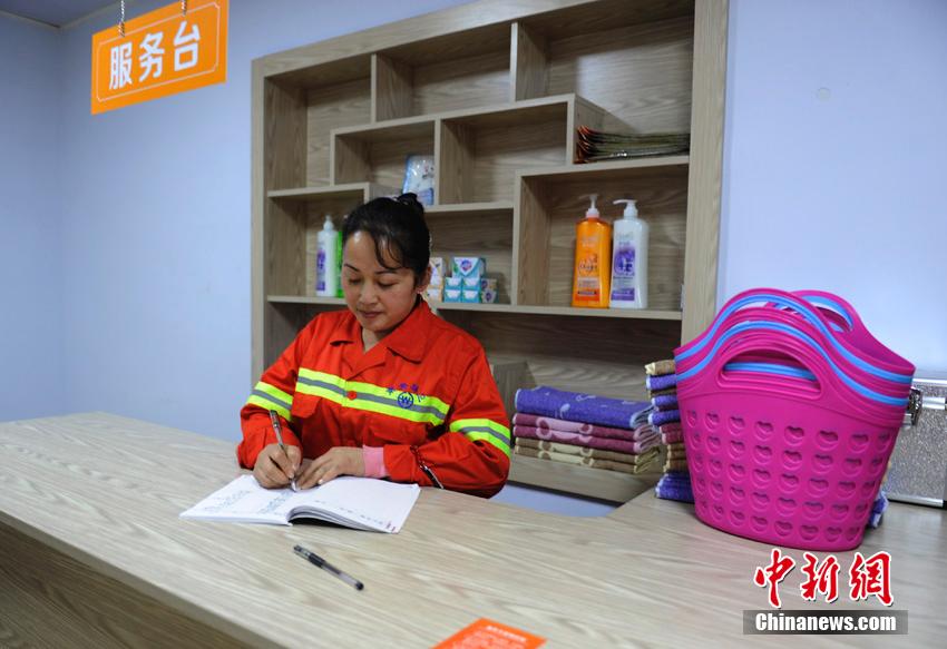 12月18日,几名刚下班的环卫工人来到一家浴池洗澡。据介绍,这家浴池由长春市南关区环卫处设立,只面向环卫工人开放,并且环卫工人在此洗浴不收门票,洗浴用品、理发也均不收费。近年来,在冬季经常连夜工作清除积雪的环卫工人引起长春各界越来越多的关注,目前长春有许多临街商铺、机构都自发设立环卫工人热水供应点、休息点,为辛苦的环卫工人们送去温暖。图为浴室吧台为环卫工人免费提供浴筐、毛巾等沐浴产品。张瑶 摄