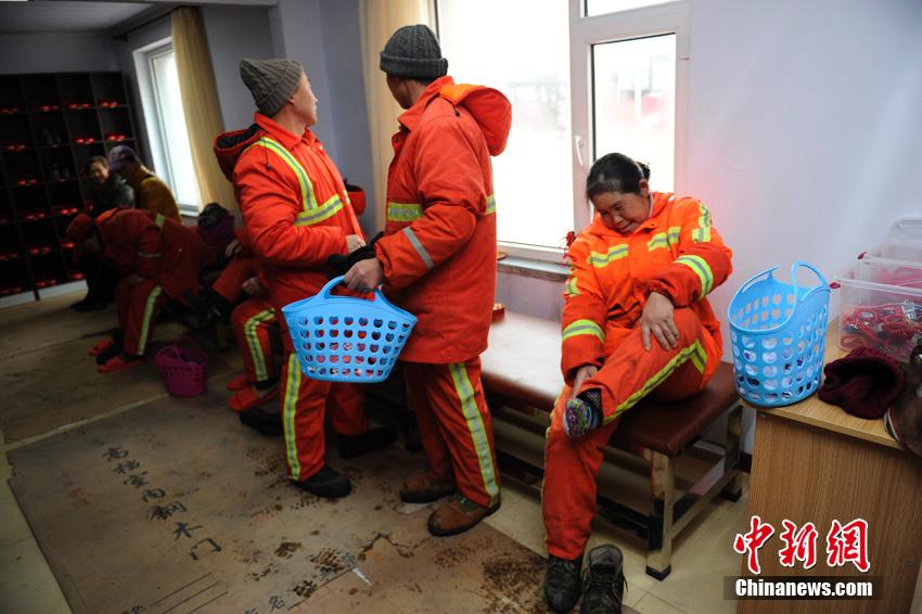 12月18日,几名刚下班的环卫工人来到一家浴池洗澡。据介绍,这家浴池由长春市南关区环卫处设立,只面向环卫工人开放,并且环卫工人在此洗浴不收门票,洗浴用品、理发也均不收费。近年来,在冬季经常连夜工作清除积雪的环卫工人引起长春各界越来越多的关注,目前长春有许多临街商铺、机构都自发设立环卫工人热水供应点、休息点,为辛苦的环卫工人们送去温暖。张瑶 摄