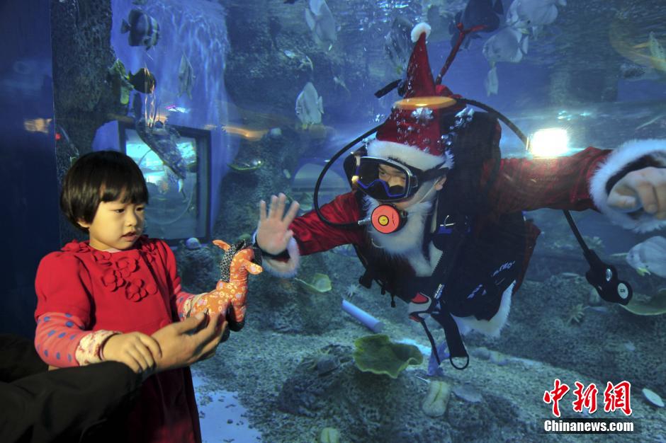 12月18日,装扮成圣诞老人的潜水员在“海底”向游客派发礼物。当日,济南大明湖海底世界举行“海底圣诞欢乐派对”活动,圣诞老人在水下与海龟共舞,并向游客派发礼物,以此迎接即将来临的圣诞节。中新社发 张勇 摄