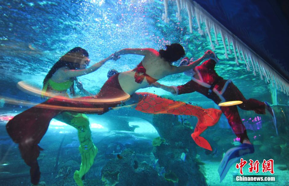 12月18日,装扮成圣诞老人的潜水员在“海底”与“美人鱼”翩翩起舞。当日,济南大明湖海底世界举行“海底圣诞欢乐派对”活动,圣诞老人在水下与“美人鱼”共舞,并向游客派发礼物,以此迎接即将来临的圣诞节。中新社发 张勇 摄
