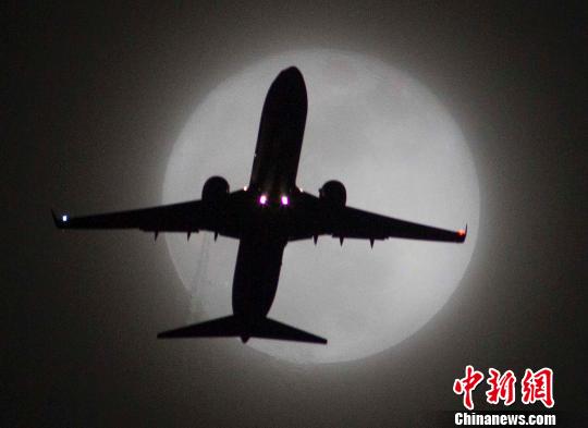 12月17日,在美国加利福尼亚州洛杉矶,一架准备降落洛杉矶国际机场的飞机从一轮笼罩在阴霾中的满月前飞过。中新社发 林戈 摄