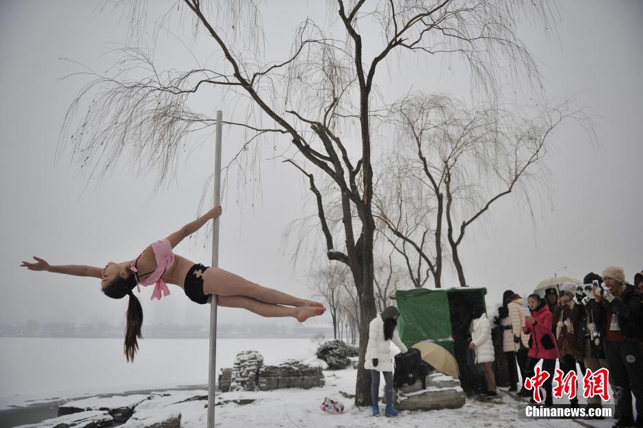 12月17日,中国钢管舞国家队队员带领着中国钢管舞运动训中心的学员们来到天津水上公园内绣技艺,引来市民的关注。当日,天津迎来入冬的第一场雪。中新社发 佟郁 摄