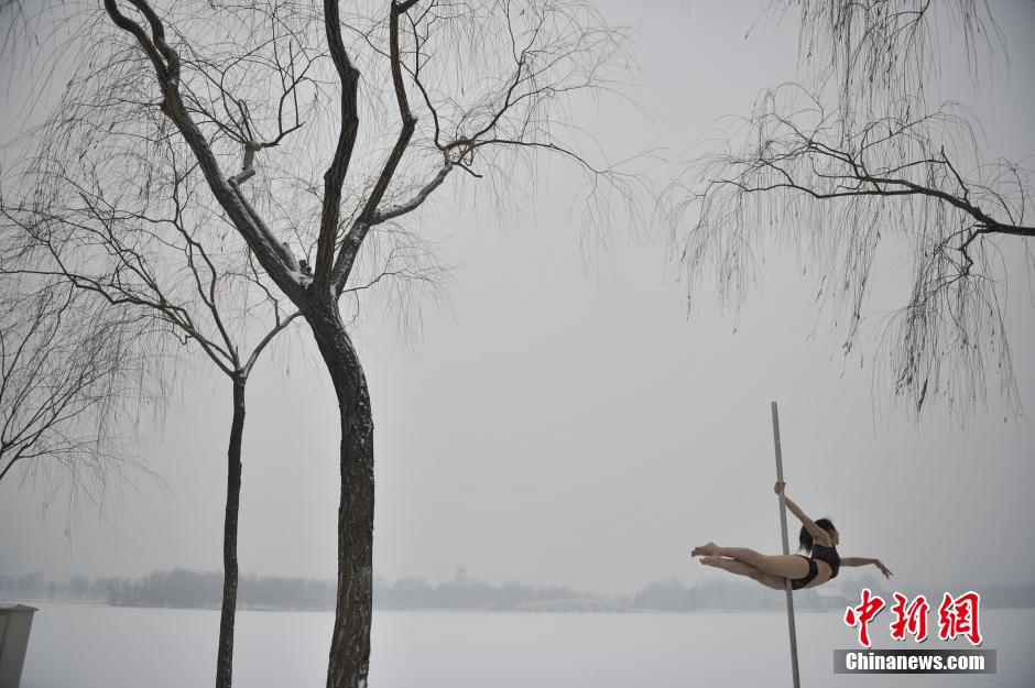12月17日,中国钢管舞国家队队员带领着中国钢管舞运动训中心的学员们来到天津水上公园内绣技艺,引来市民的关注。当日,天津迎来入冬的第一场雪。中新社发 佟郁 摄