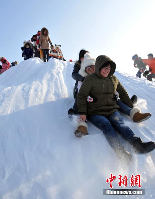 12月22日,第26届中国哈尔滨·太阳岛国际雪雕艺术博览会在哈尔滨开幕。图为游客在雪堆上滑雪。中新社发 胡迪 摄