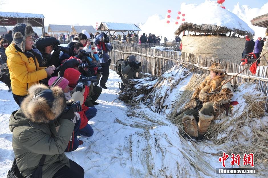 12月22日,第26届中国哈尔滨·太阳岛国际雪雕艺术博览会在哈尔滨开幕。图为游客正在拍摄“乡村人家”的主人。中新社发 胡迪 摄