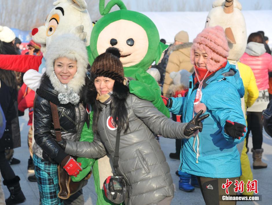 12月22日,第26届中国哈尔滨·太阳岛国际雪雕艺术博览会在哈尔滨开幕。图为游客与卡通人物合影留念。中新社发 胡迪 摄
