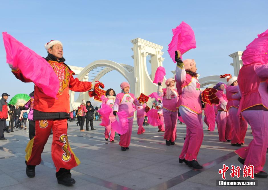 12月22日,第26届中国哈尔滨·太阳岛国际雪雕艺术博览会在哈尔滨开幕。图为开幕式上的大秧歌表演队。中新社发 胡迪 摄