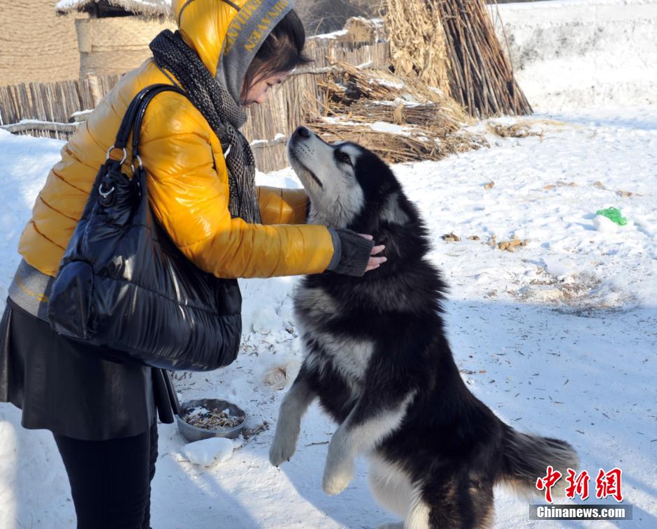 12月22日,第26届中国哈尔滨·太阳岛国际雪雕艺术博览会在哈尔滨开幕。图为游客与“护院狗”亲密接触。中新社发 胡迪 摄