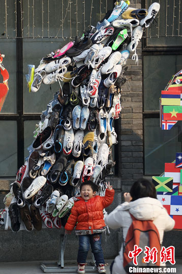 12月22日,一组用球鞋、乒乓球拍、篮球、足球和世界各国国旗组成的“1912”亮相南京时尚青年汇聚之地1912时尚街区。中新社发 泱波 摄