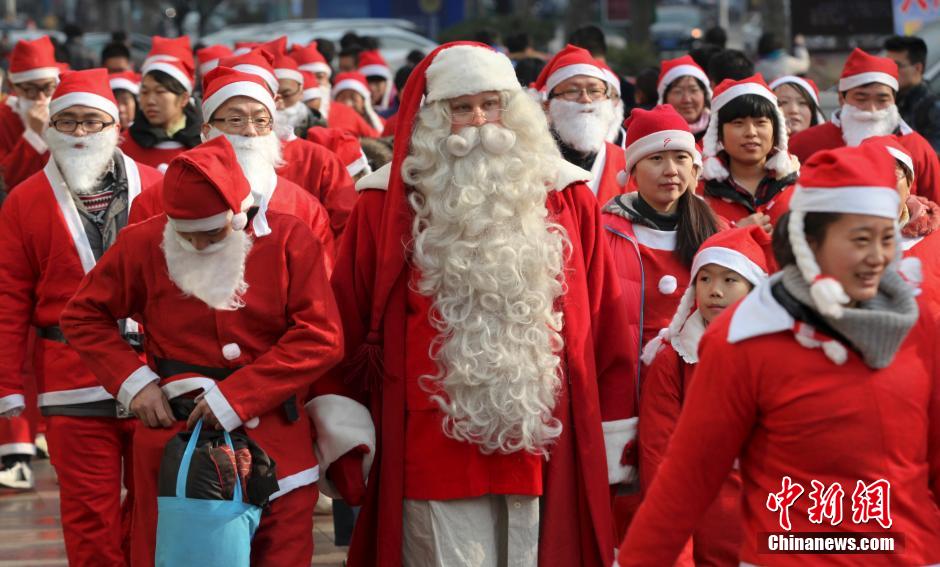 12月22日,芬兰“正版圣诞老人”现身济南街头,与济南版“圣诞老人”联欢。当日,来自芬兰“圣诞老人村”的圣诞老人,济南街头邀市民扮“圣诞老人”,迎接圣诞节到来。中新社发 张勇 摄