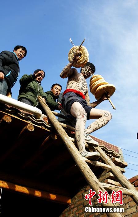 12月22日下午,居住在青海省黄南藏族自治州同仁县年都乎村的土族民众举行“跳於菟”活动。图为一名“跳於菟”表演者正在下扶梯。中新社发 胡贵龙 摄