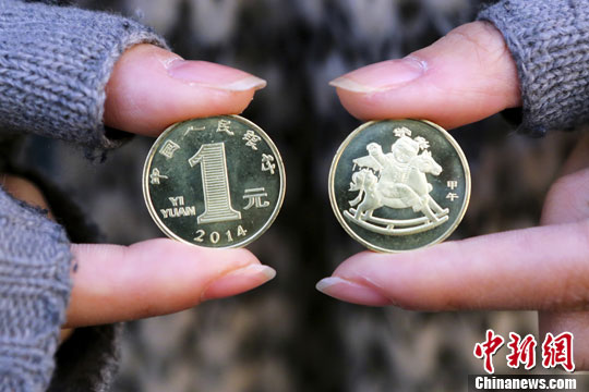 12月24日,兑换到1元马年贺岁纪念币的市民展示硬币。中新社发 李慧思 摄