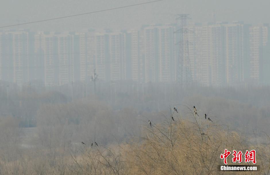 12月23日,山西太原被一片雾霾笼罩,数只小鸟在汾河岸边树枝上嬉戏。据中央气象台消息,未来三天中国中东部的部分地区有雾或霾,其中,华北中南部、黄淮北部、陕西关中等地的部分地区有中度霾,局地重度霾。中新社发 韦亮 摄