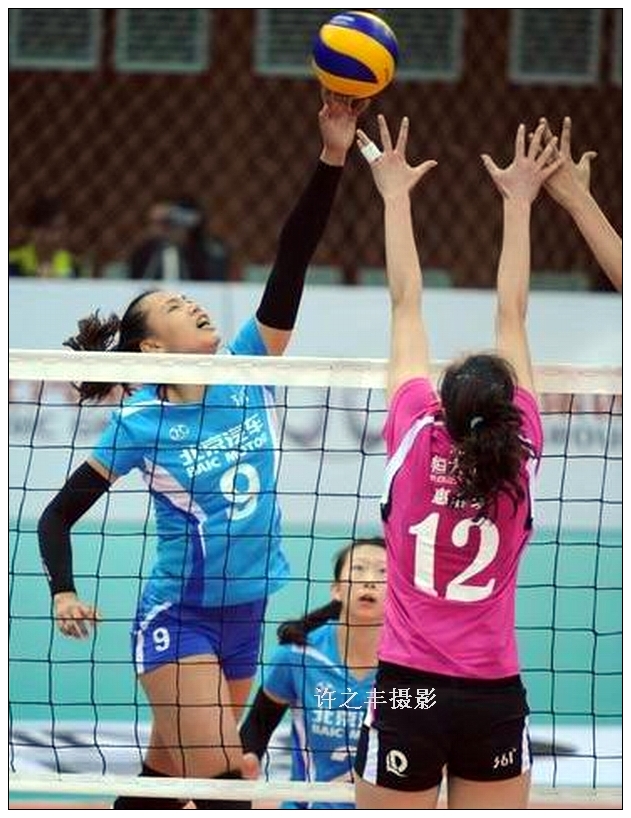 2013年12月24日晚,2013-2014赛季全国女排联赛第七轮的比赛。四连胜的北京女排主场迎战保持不败的广东恒大。恒大的外援霍奇在首局中受伤下场乱了本队的部署,气势大振的北京队直落三局完胜恒大收获五连胜,三局比分为25比20、25比16和25比19。恒大女排虽遭赛季首场失利但依然以3分优势在B组中领先。 许之丰摄影2013年12月24日记录于北京