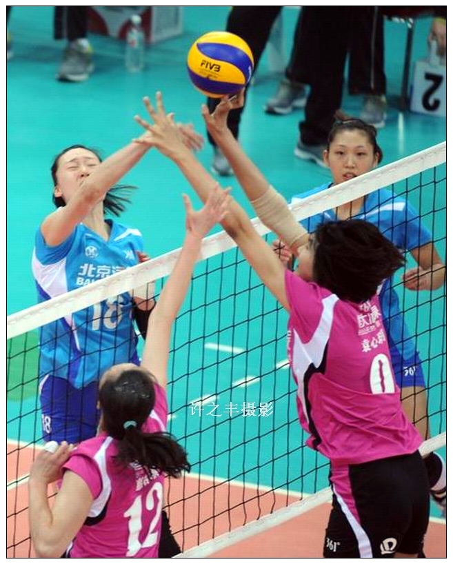 2013年12月24日晚,2013-2014赛季全国女排联赛第七轮的比赛。四连胜的北京女排主场迎战保持不败的广东恒大。恒大的外援霍奇在首局中受伤下场乱了本队的部署,气势大振的北京队直落三局完胜恒大收获五连胜,三局比分为25比20、25比16和25比19。恒大女排虽遭赛季首场失利但依然以3分优势在B组中领先。         许之丰摄影2013年12月24日记录于北京