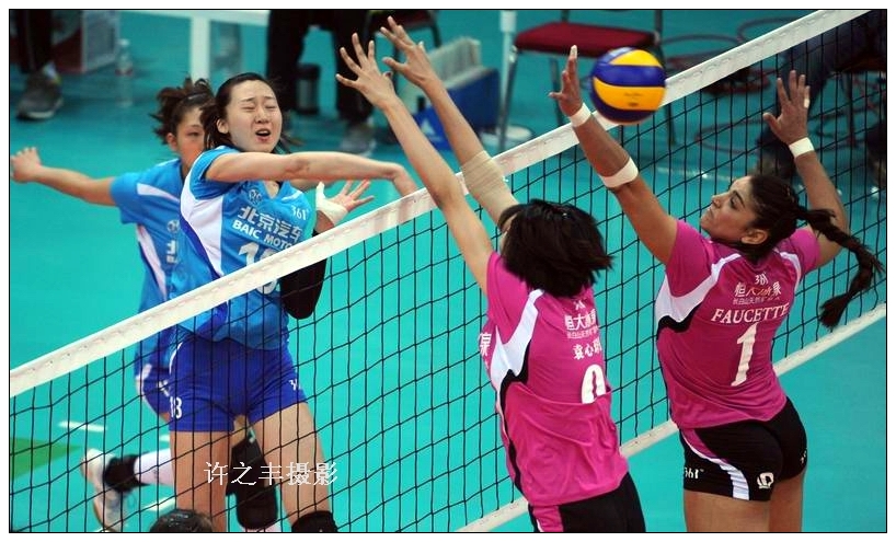 2013年12月24日晚,2013-2014赛季全国女排联赛第七轮的比赛。四连胜的北京女排主场迎战保持不败的广东恒大。恒大的外援霍奇在首局中受伤下场乱了本队的部署,气势大振的北京队直落三局完胜恒大收获五连胜,三局比分为25比20、25比16和25比19。恒大女排虽遭赛季首场失利但依然以3分优势在B组中领先。         许之丰摄影2013年12月24日记录于北京