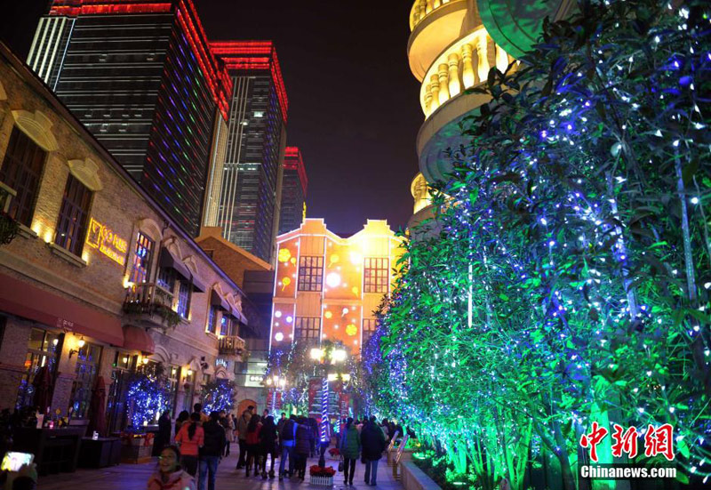 12月24日平安夜,湖北武汉楚河汉街各种圣诞灯饰流光溢彩,挤满了逛街的市民。圣诞节是西方国家一年中最重要的节日之一,近年来,圣诞购物季快速走进中国。中新社发 张畅 摄