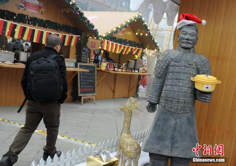 12月24日,在西安市钟楼广场,一尊兵马俑头戴圣诞帽“变身”为圣诞老人,格外引人注目。中新社发 张远 摄