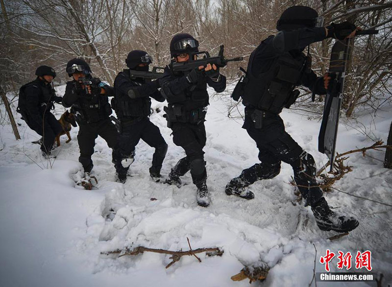 岁末年尾,新疆首府乌鲁木齐市低温降至零下10余摄氏度,乌鲁木齐市公安局特警八支队所属的飞虎突击队在驻地附近的树林中模拟场景进行反恐搜捕演练,飞虎队员5人一组,组成搜捕队形,在林雪中进行地毯式搜索。据了解,特警八支队是一支快速反应力量,主要职能是处置暴力恐怖犯罪事件、严重暴力性犯罪事件、大规模群众滋事等重大治安事件。图为飞虎队员快速堵截,将“歹徒”控制。刘新 摄