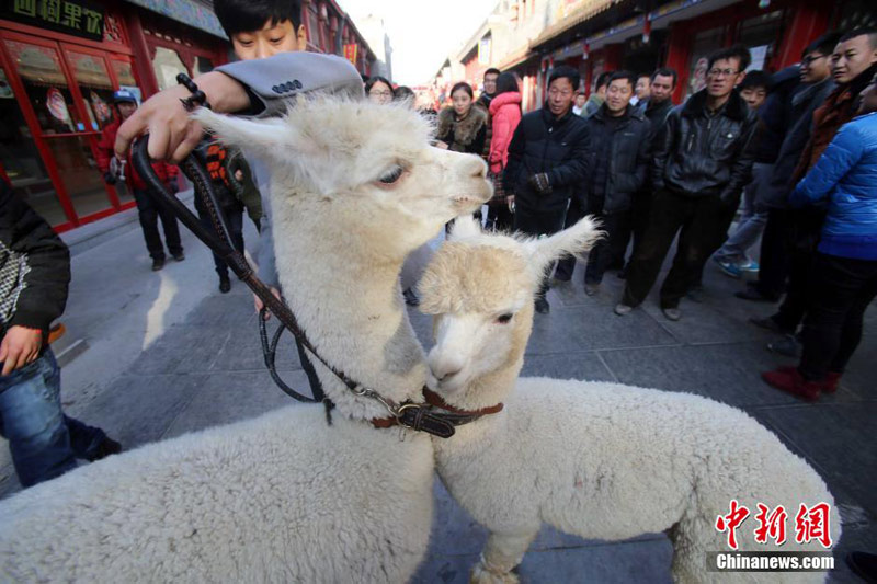 12月25日,在山西太原食品街一饭店前,两只“网络神兽”羊驼正在走秀,引来许多市民围观拍照。“网络神兽”学名为羊驼,是一种性格温顺,伶俐而通人性的群居动物,不知何时在网络爆红。张云 摄