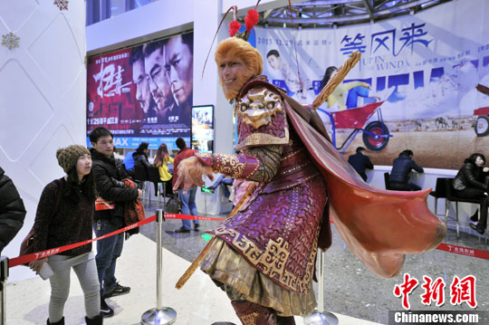 12月26日,一尊高3米的孙悟空蜡像亮相福州某电影院,吸人眼球。据悉,该款孙悟空蜡像全球限量99尊,售价5万元人民币。中新社发 吕明 摄