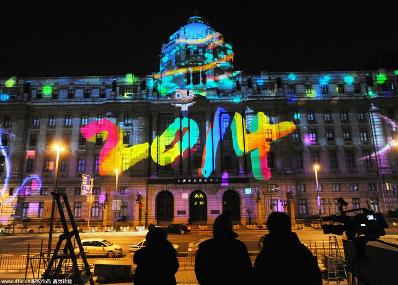 2013年12月27日,上海。当天凌晨1时许,2014年外滩4D新年倒计时灯光秀进行了首场现场调试,与往年不同的是,10分钟左右的光影变幻呈现出美仑美奂的环球之旅梦境,今年的灯光秀以一位可爱的小男孩--“小Q”为主角,他的卡通形象将带着观众一起环游世界,乘坐蛟龙号畅游海底,甚至登上神秘的“月球”。最精彩部分要数在灯光秀接近尾声时,数百张孩子的笑脸瞬间投影在两幢大楼之上。这场“环球梦之旅”的4D灯光秀将于12月31日晚正式上演,届时将给市民观众带来一场震撼的视觉盛宴。