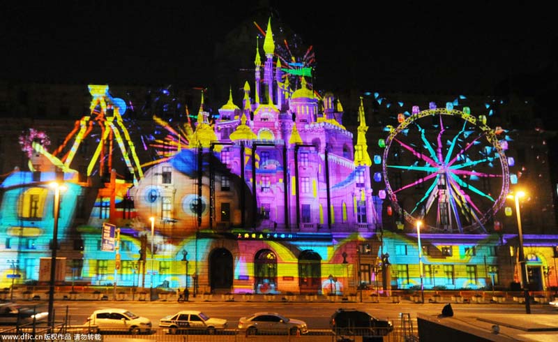 2013年12月27日,上海。当天凌晨1时许,2014年外滩4D新年倒计时灯光秀进行了首场现场调试,与往年不同的是,10分钟左右的光影变幻呈现出美仑美奂的环球之旅梦境,今年的灯光秀以一位可爱的小男孩--“小Q”为主角,他的卡通形象将带着观众一起环游世界,乘坐蛟龙号畅游海底,甚至登上神秘的“月球”。最精彩部分要数在灯光秀接近尾声时,数百张孩子的笑脸瞬间投影在两幢大楼之上。这场“环球梦之旅”的4D灯光秀将于12月31日晚正式上演,届时将给市民观众带来一场震撼的视觉盛宴。