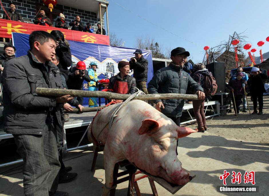 冬月尾,腊月初,是土家族杀年猪和吃刨汤的传统节日。12月28日,在湖北五峰土家族自治县长乐坪镇三教庙村,当地农户和周边游客近千人参加了一场年猪刨汤宴,农户们俗称年猪节。年猪祭祀是年猪节的重头戏,整个祭祀活动分为喜迎年猪、献祭品、进香、祭拜和抬年猪巡游等环节。祭祀过后,在五峰南曲和土家民俗打击乐的演奏声中,大家喝起土家族自酿包谷酒,吃起了土家族传统的“抬格子”和“杀猪饭”,共同祈求来年丰衣足食、幸福安康。刘良伟 摄