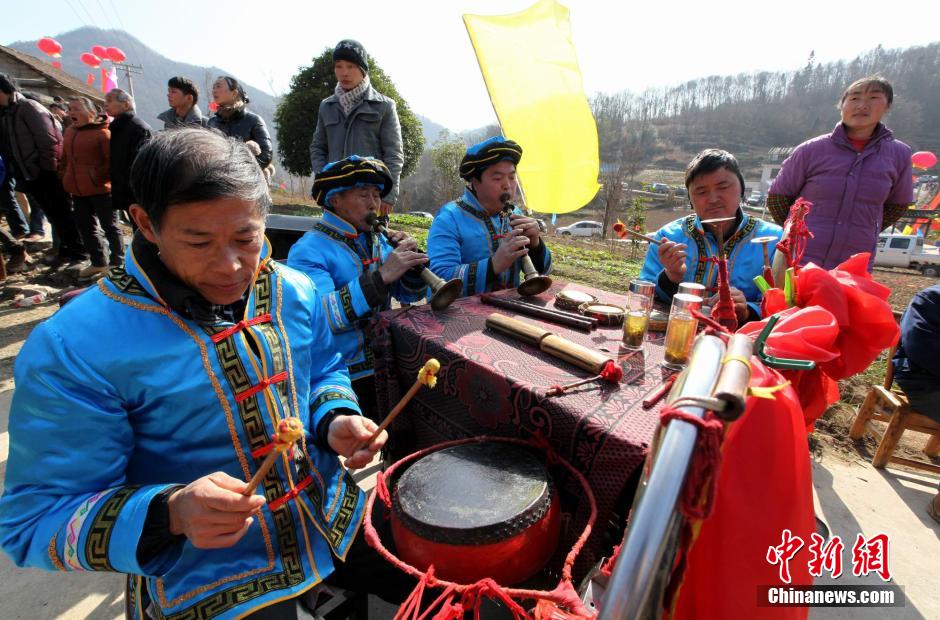 冬月尾,腊月初,是土家族杀年猪和吃刨汤的传统节日。12月28日,在湖北五峰土家族自治县长乐坪镇三教庙村,当地农户和周边游客近千人参加了一场年猪刨汤宴,农户们俗称年猪节。图为当地农户演奏“非遗”五峰南曲。图为土家打击乐助兴。刘良伟 摄