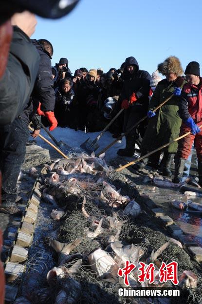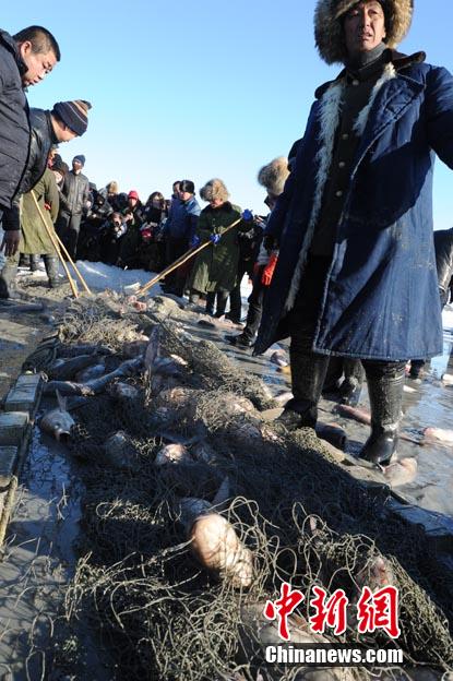 吉林松原查干湖2013年冬季捕鱼活动12月28日正式开启,当天单网就捞出大约10万斤鱼,再次成为奇观,而随后在现场举行的拍卖活动中,当天出网的第一尾鱼拍出了288888元人民币的天价。崔颜锋 摄