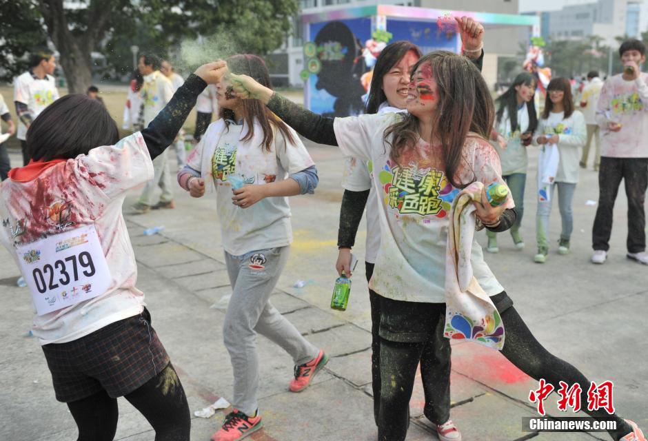 12月28日,福州工程学院举行康师傅“健康彩色跑”活动,现场数千名学生、白领和小孩参加了这场色彩与运动的盛会。图为工作人员向通过彩粉站的人员撒粉。吕明 摄