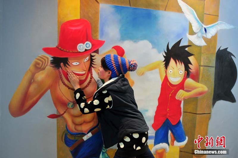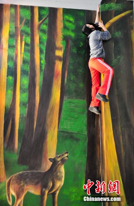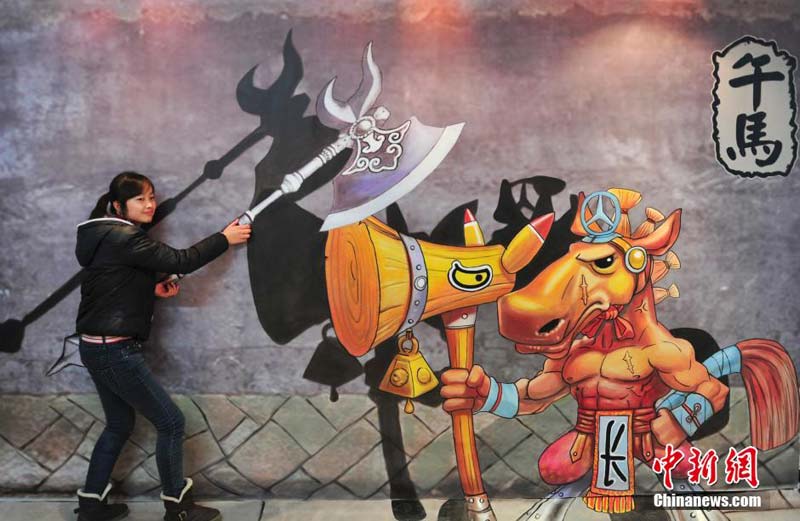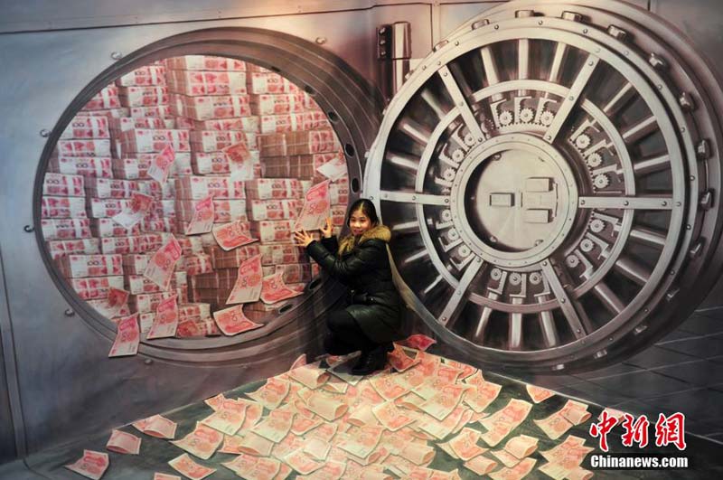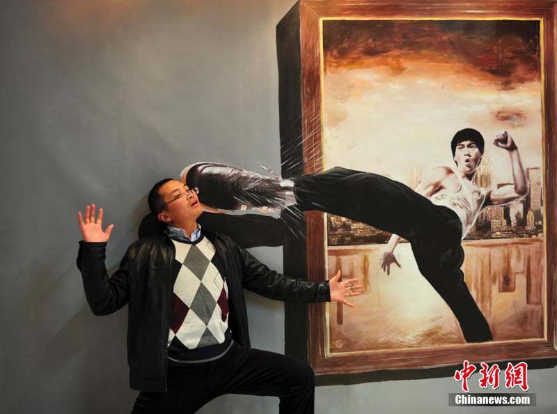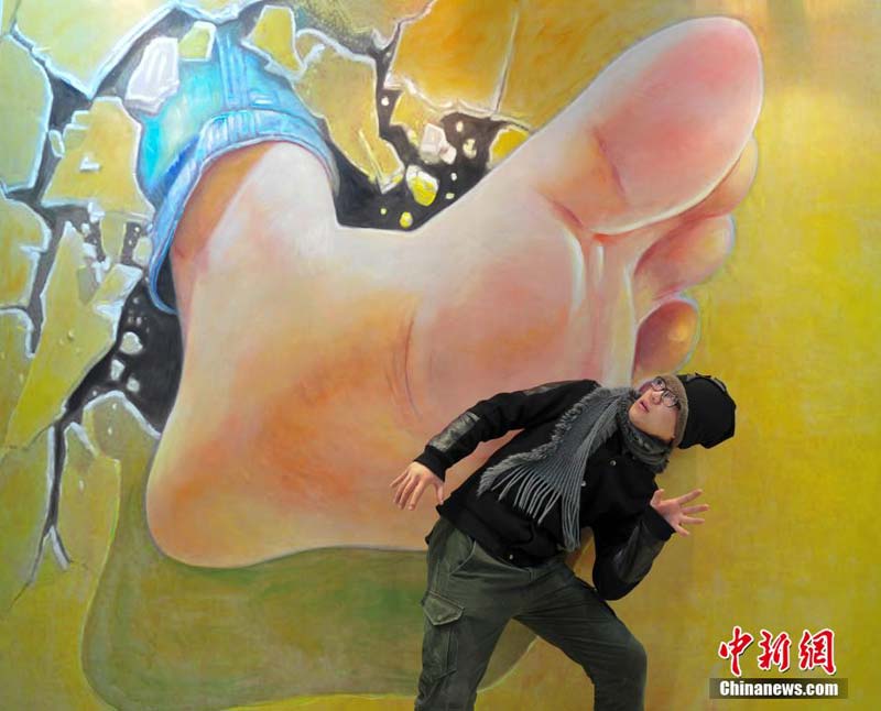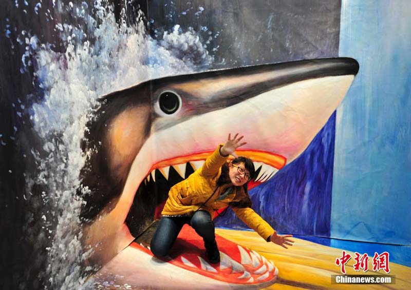 12月29日,在济南举办的“济南首届3D魔幻世界艺术展”上,艺术家通过画笔让在梦幻中才能见到的情景,以“欺骗”自己眼睛的三维立体处理方式展现在人们面前,吸引许多参观者上前一试身手,体验“魔幻世界”恶搞乐趣。图为观众体验3D梦幻艺术。中新社发 张勇 摄
